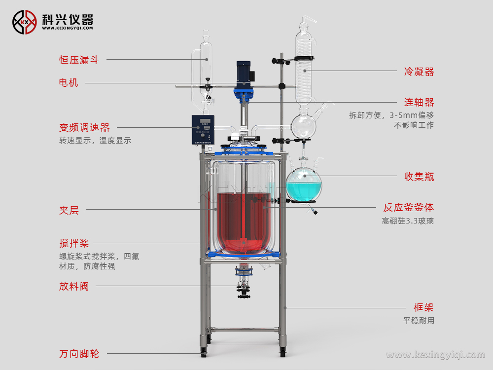 雙層玻璃反應釜為雙層玻璃設計,內(nèi)層放入反應溶媒可做攪拌反應,夾層可通上不同的冷熱源(冷凍液,熱水或熱油)做高溫反應(配置相應的循環(huán)油浴鍋,溫度可以達到300℃)或低溫反應(配置相應的低溫冷凍液循環(huán)系統(tǒng),溫度可以達到-80℃),也可選擇加熱制冷一體循環(huán)機;在設定恒溫條件下,在密閉的玻璃反應器內(nèi),可根據(jù)使用要求在常壓或負壓條件下進行攪拌反應,并能做反應溶液的回流與蒸餾,使用中可以抽成真空,從而做真空反應。是現(xiàn)代精細化工、生物制藥和新材料合成的理想中試、生產(chǎn)設備。它的這種設計使試驗更加的安全,更加的方便。